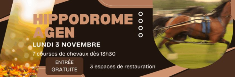 L'Association des Courses Hippiques de l'Agenais invite le public à sa prochaine réunion hippique qui se tiendra le Lundi 3 Novembre 2025 à l'Hippodrome d'Agen - La Garenne.