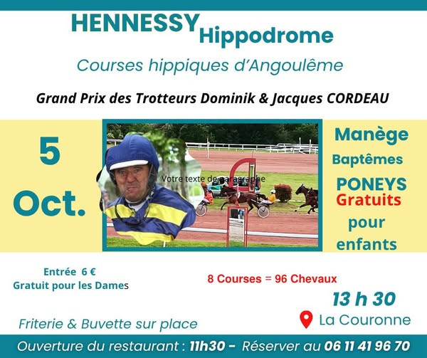 Ne manquez pas cette occasion de vivre une expérience unique alliant sport, convivialité et divertissement en famille. Rendez-vous donc à l’Hippodrome d’Angoulême pour une journée mémorable !
