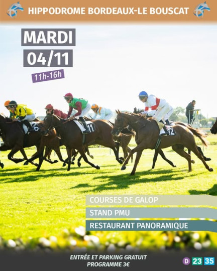 L’Hippodrome du Bouscat s’apprête à vibrer au rythme des sabots ce mardi 4 novembre, à l’occasion d’une journée dédiée aux courses de galop. De 11h à 16h, les passionnés comme les curieux pourront profiter d’un programme riche en émotions et en découvertes.