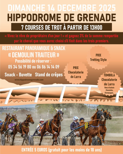 L'Hippodrome de Grenade-sur-Garonne s'apprête à accueillir une journée exceptionnelle de son meeting d'hiver. Le dimanche 14 décembre, les passionnés de trot et le grand public sont invités à une réunion hippique qui combinera l'adrénaline des courses avec la magie des fêtes de fin d'année, notamment grâce à une tombola de Noël dotée de lots attractifs.
